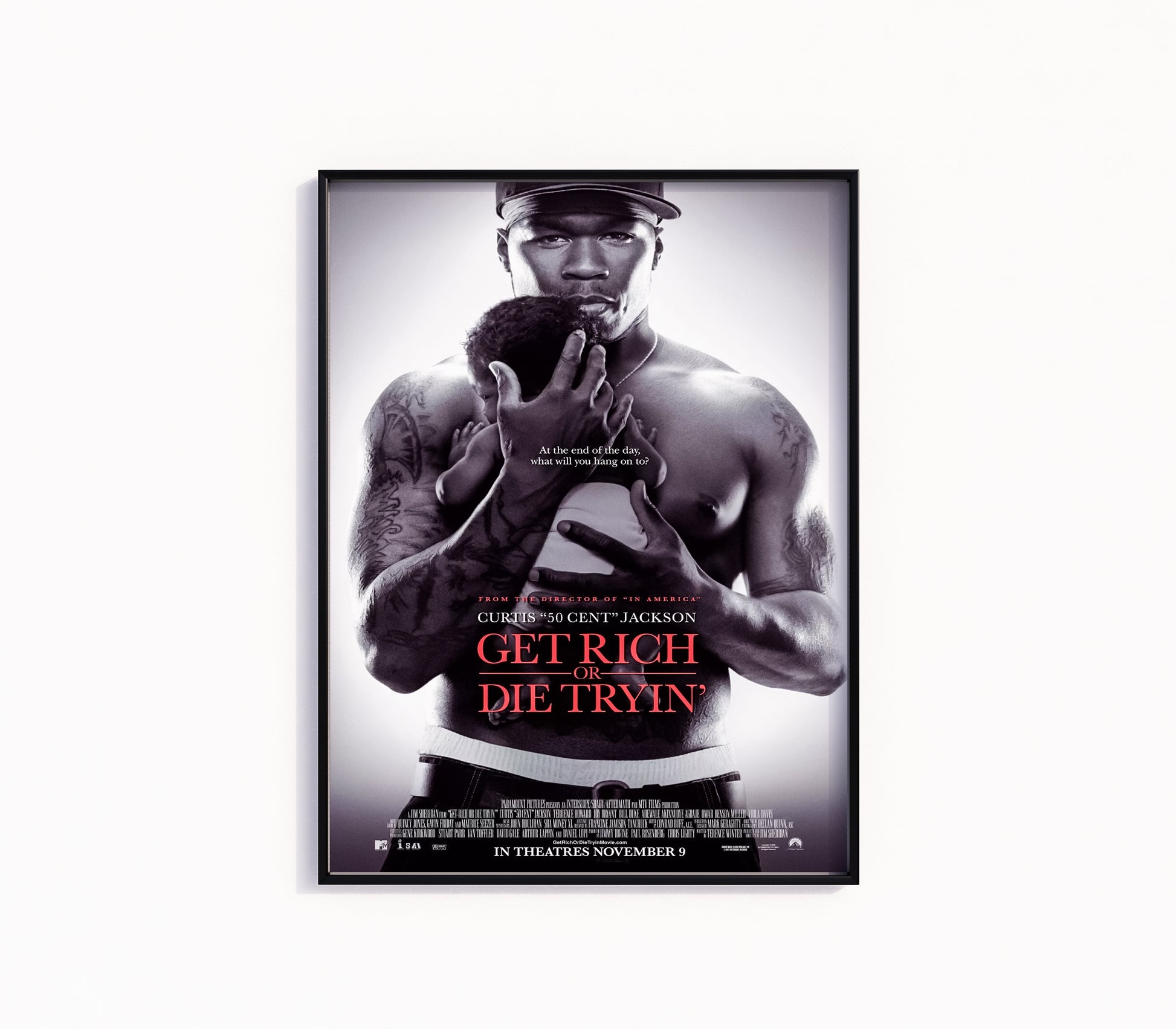 This 50 Cent poster features the iconic and powerful image of the rapper from his debut album "Get Rich or Die Tryin." Perfect for fans and music enthusiasts, this poster showcases a piece of hip-hop history.