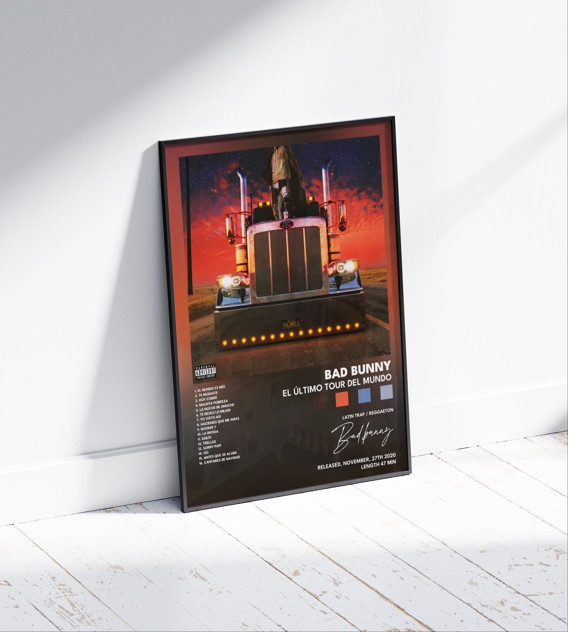 Celebrate Bad Bunny's iconic "El Último Tour Del Mundo" with this striking album poster. Featuring bold artwork that captures the energy and aesthetic of one of reggaeton's most influential tours, this print brings concert nostalgia and cultural significance to any space. Perfect for fans, collectors, and music enthusiasts who appreciate Latin hip-hop history. High-quality printing ensures vibrant colours and sharp detail that stand the test of time. A must-have for any Bad Bunny collection.