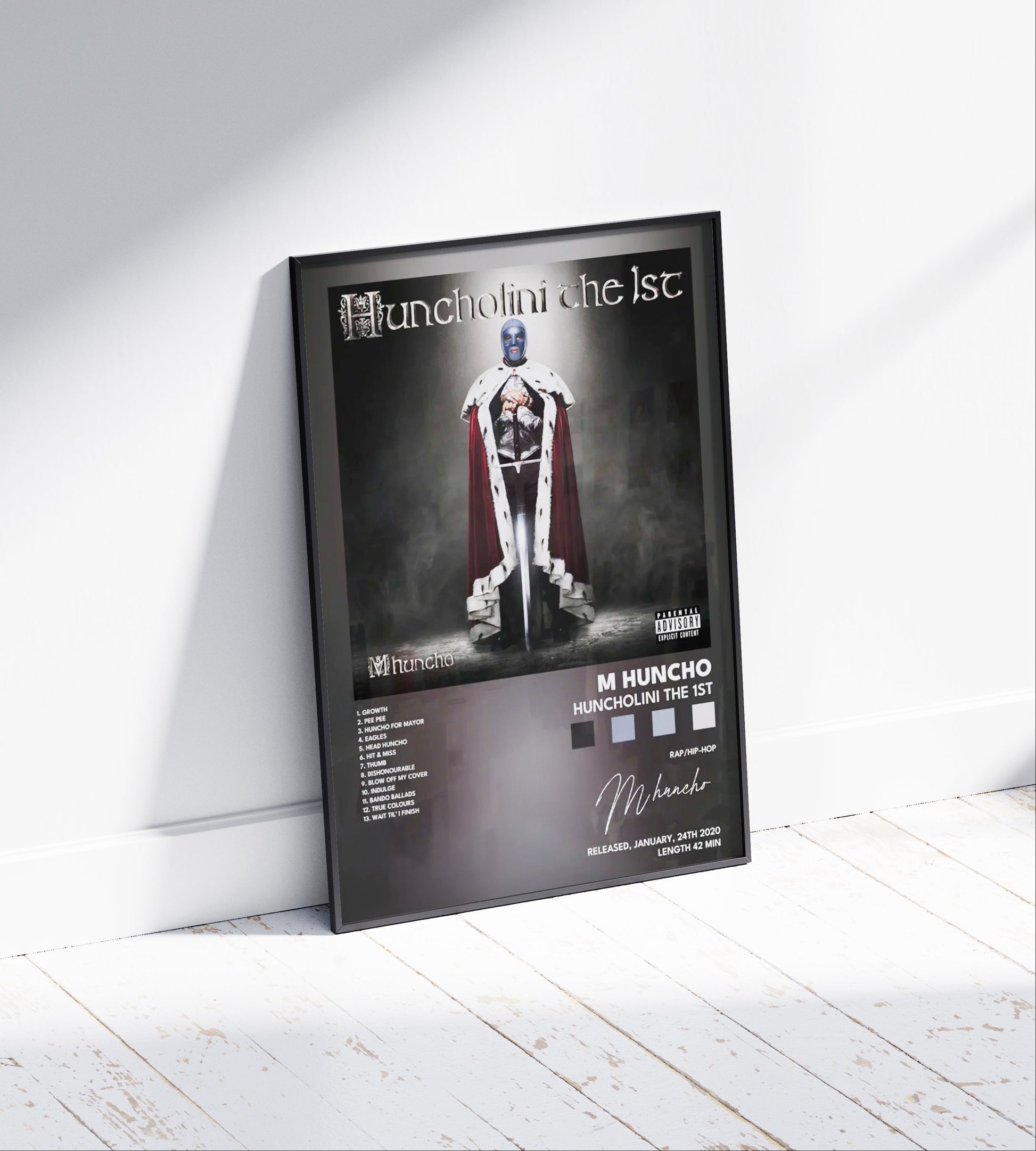 M Huncho's debut album 'Huncholini The 1st' captured a pivotal moment in UK rap. This poster celebrates the project with striking visual design, making it an essential addition for collectors and fans of contemporary British hip-hop. Display it to showcase your appreciation for one of the genre's most influential releases. High-quality print ensures vibrant colours and lasting clarity on any wall.