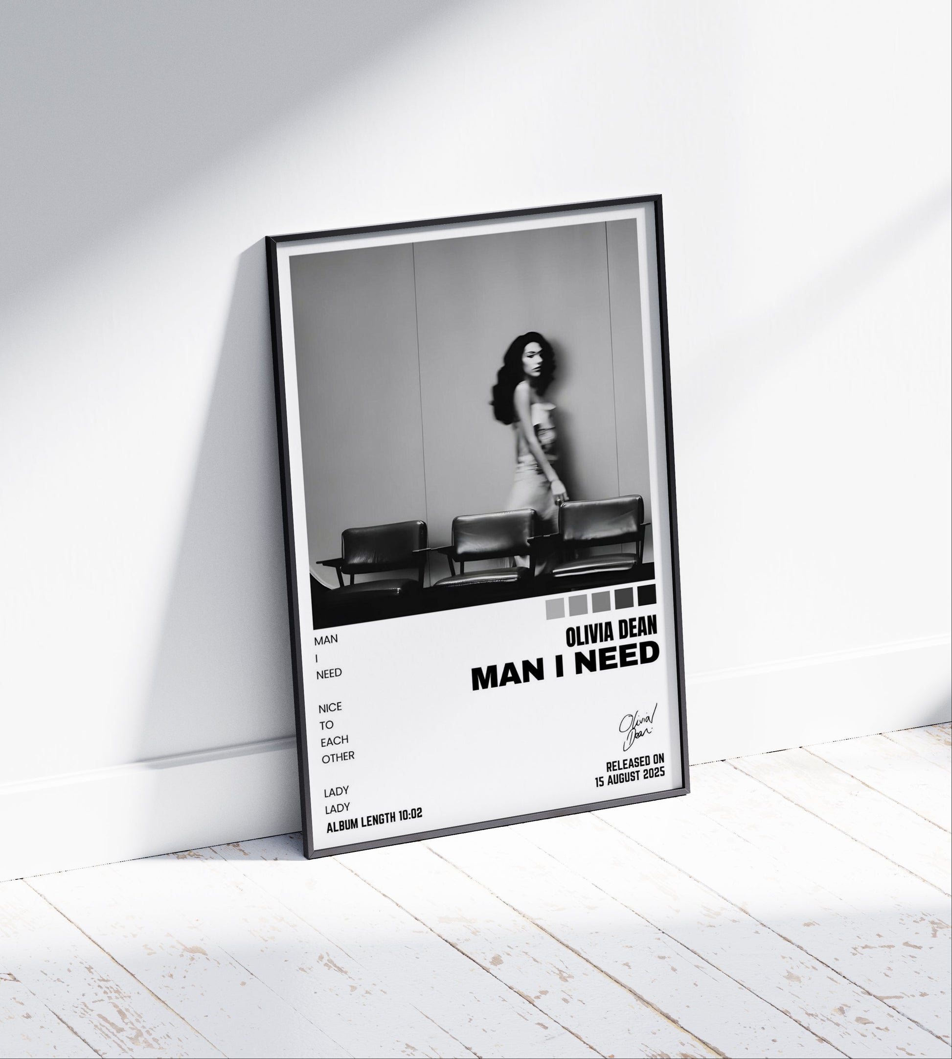 Olivia Dean's 'Man I Need' poster captures the essence of this rising R&B talent in striking visual form. Perfect for music enthusiasts and fans of contemporary soul, this print brings sophisticated style to any room. High-quality reproduction ensures vibrant colours and crisp detail that endure. Whether you're decorating a bedroom, studio, or living space, this poster celebrates modern R&B artistry with understated elegance. An ideal addition for collectors of music memorabilia and those who appreciate emerging artists shaping today's sound.